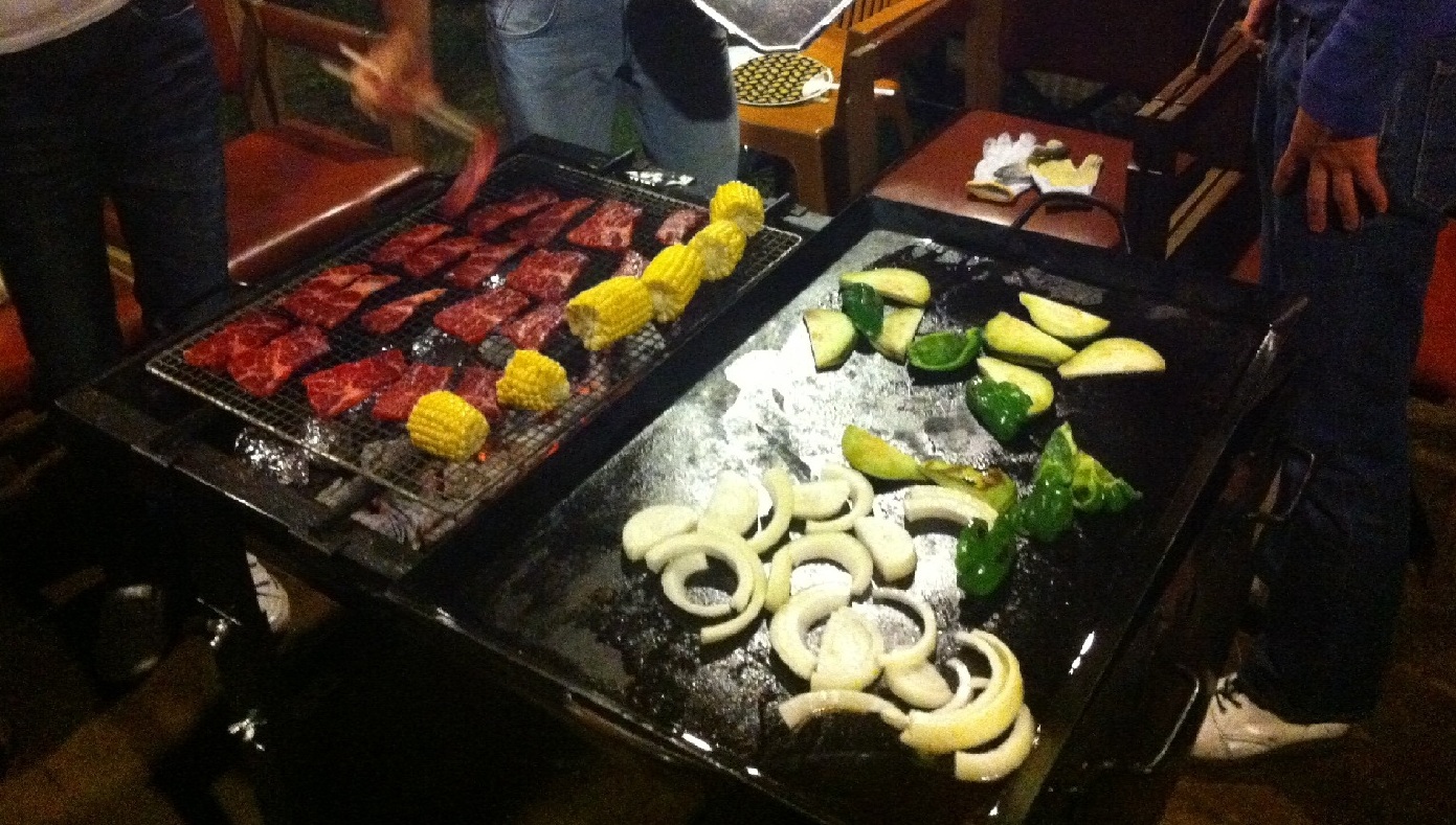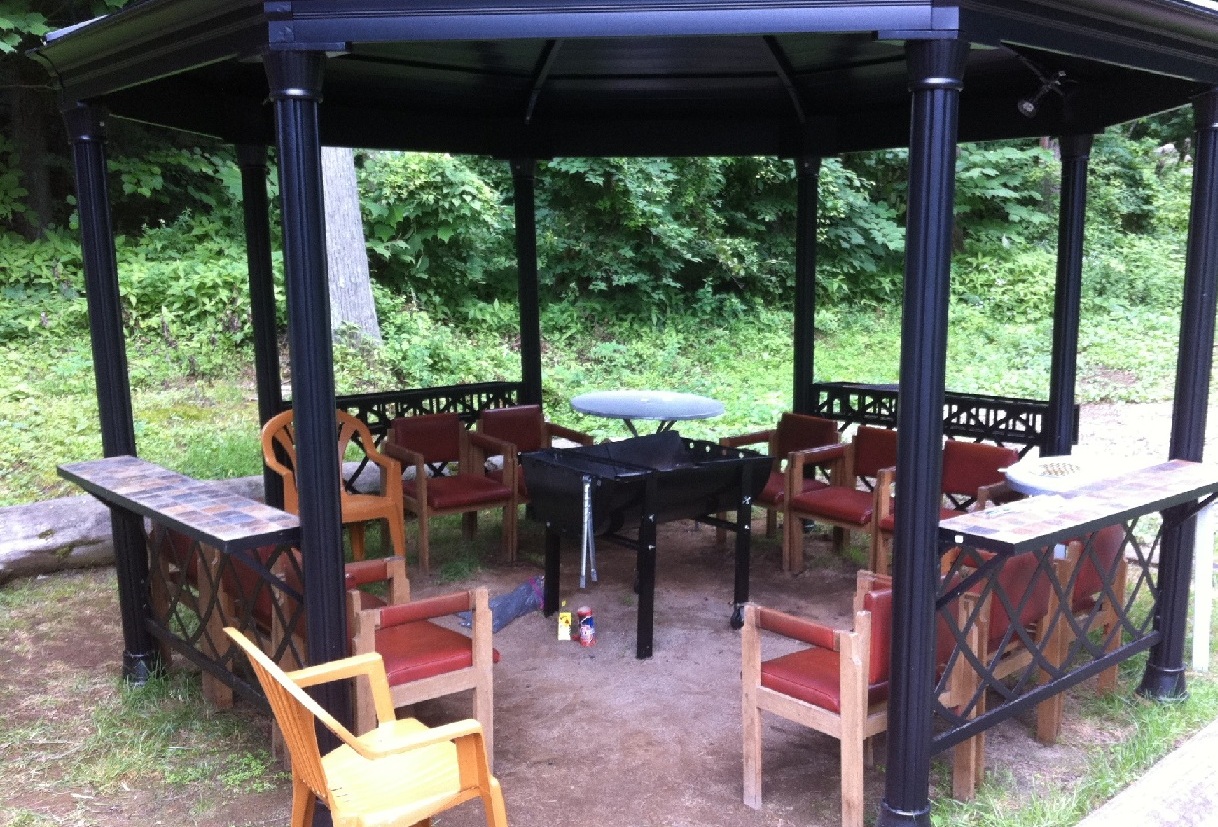 コテージの真横にBBQ専用のスペースがあって、そこで鉄板囲んで飲み食いが可能!