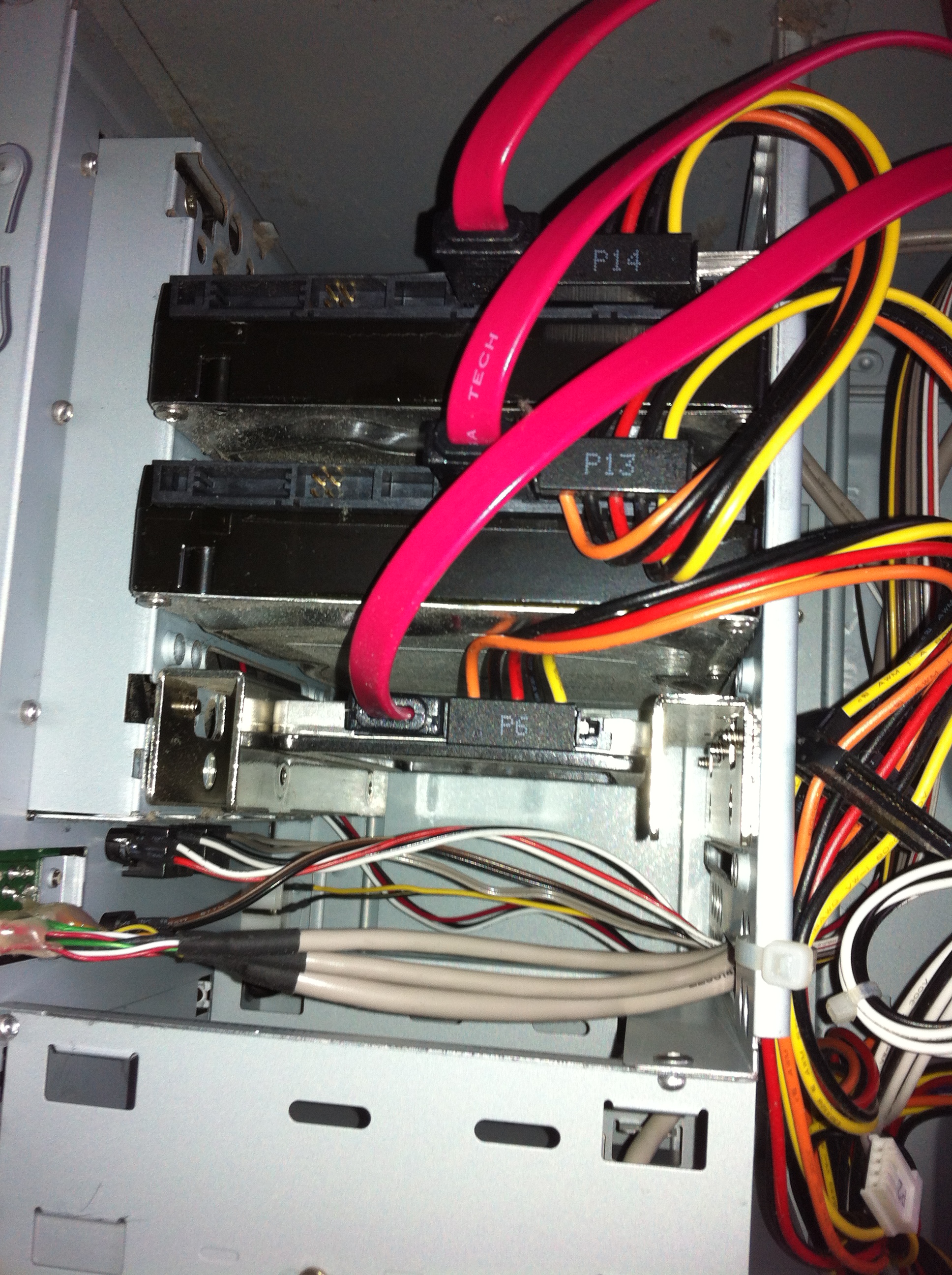 写真の濃いピンクの平べったいケーブル(SATA)が刺さってる一番下の奴。